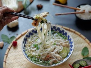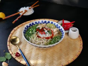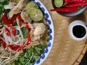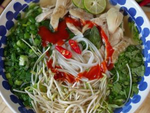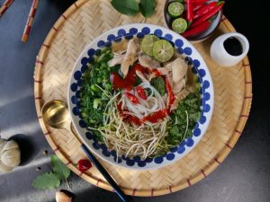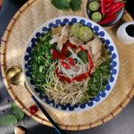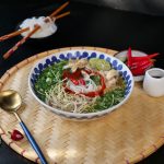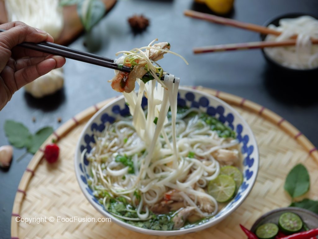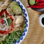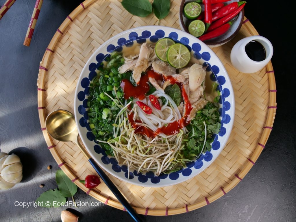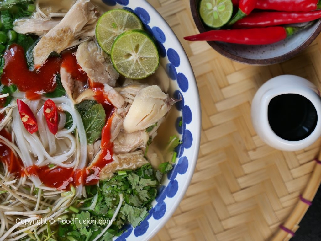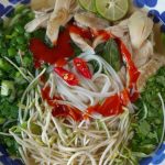 -In a serving bowl,add rice noodles,spring onion,shredded chicken,fresh coriander,bean sprouts,fresh basil leaves,lime slices & prepared flavor ful broth.
