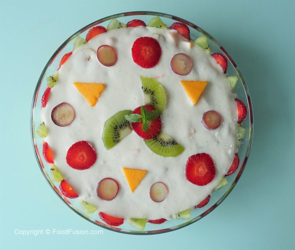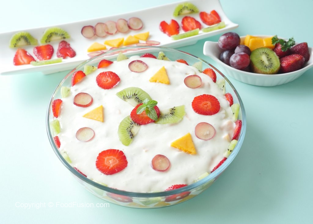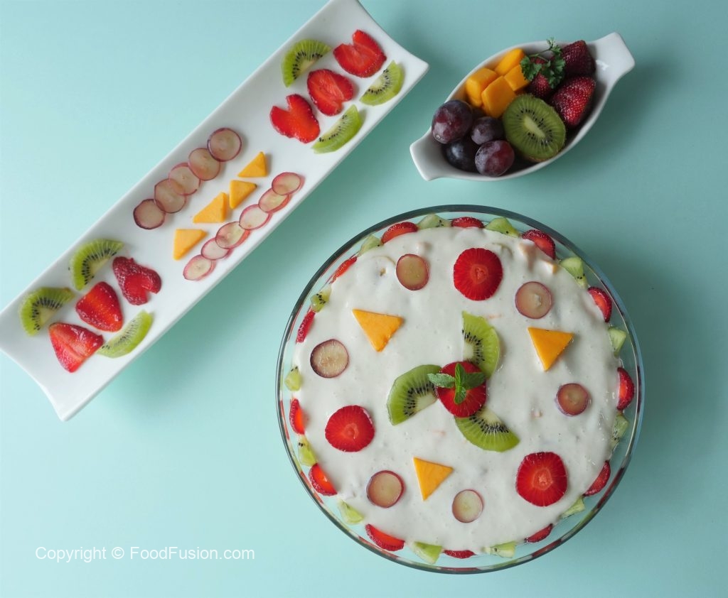 Serving dish mein banana,aam,strawberries,kiwi aur tayyar yogurt fruits dal ker serve karein.