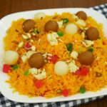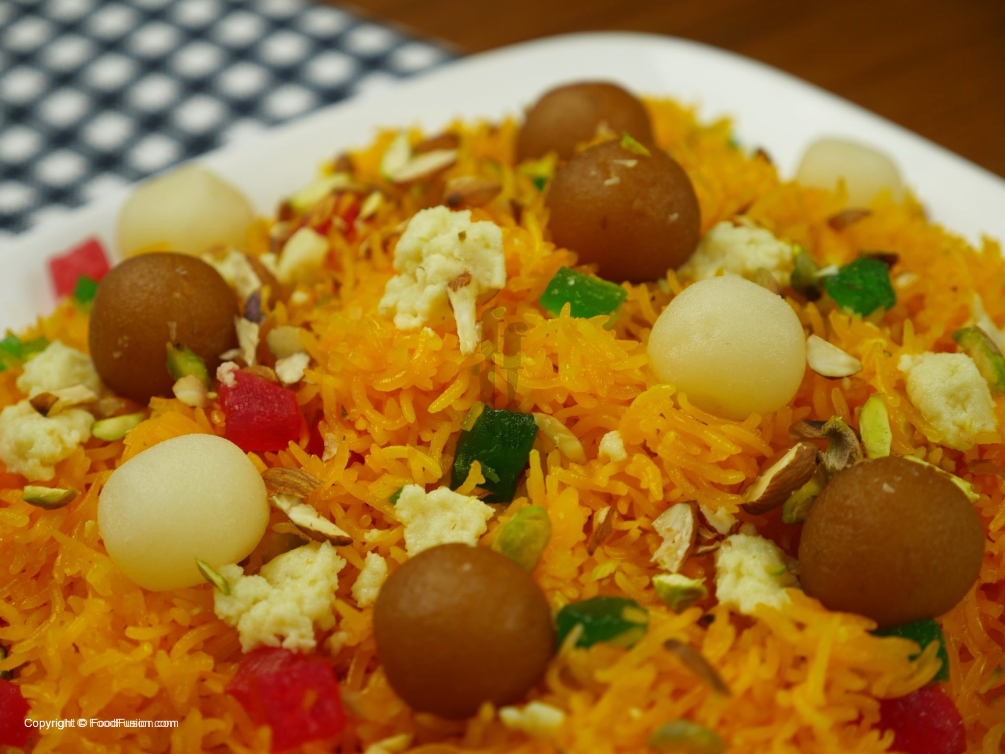 Zarda is ready, add gulab jamun and chum chum for garnishing.